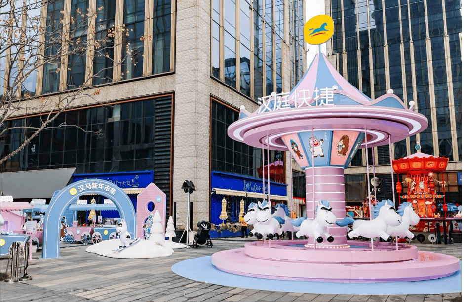 远远看去,蓝粉交织的场景设计,梦幻、童真与人间烟火气恰到好处地相融,宛如藏在都市里的梦幻乐园,又像是酒店业的迪士尼。而这一切,也印证着:国民喜欢什么,汉庭就造什么。