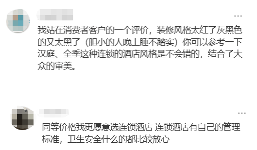 大致意思是,建议老板可以直接参考他们,符合大众审美,肯定错不了。毕竟同等价位,连锁酒店有自己的管理标准,卫生安全什么的,都比较放心。