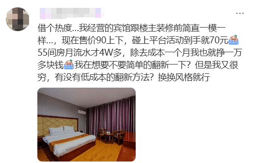 就像这位宾馆老板吐槽的一样:“我55间房月流水才4W多,除去成本一个月就挣一万多块钱,我在想要不要简单翻新一下?但是我又很穷,有没有低成本的翻新方法,换换风格就行。”