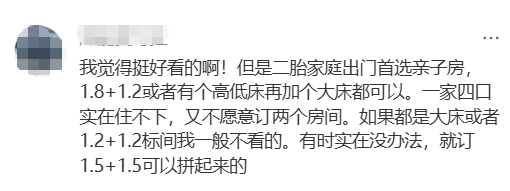 “二胎家庭出门我首选亲子房,一张1.8米+一张1.2米,或者一张高低床再加张大床,要是只有两张1.2米的标间,我一般都不看的。实在没办法,就订1.5+1.5的拼起来。”