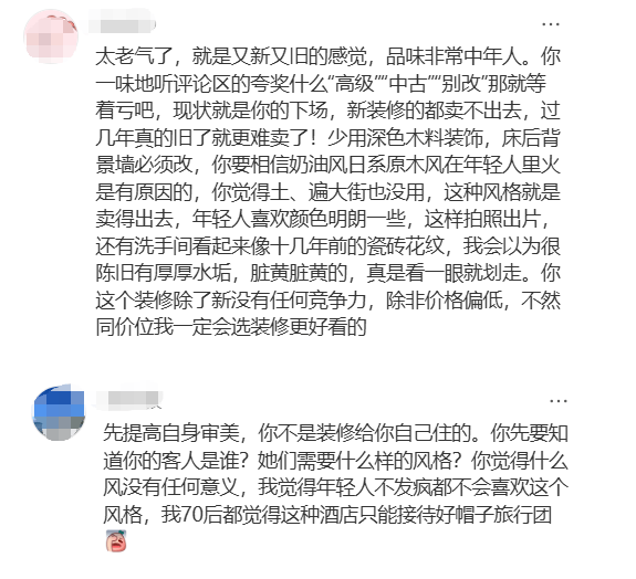 比如,讨论最多的就是装修风格问题:老气、昏暗、压抑、活像从70-80年代翻新到90年代,年轻人看不上,中老年人也嫌弃。