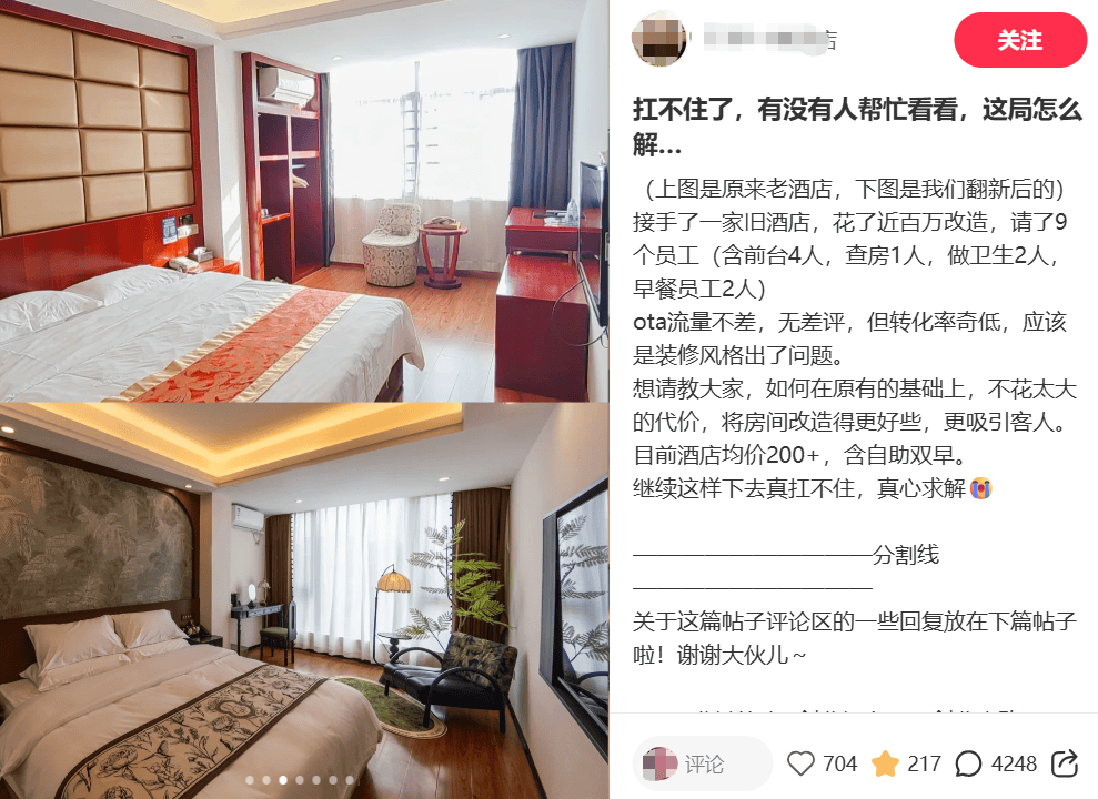 在笔者看来,这则求助贴,恰是存量酒店市场的一个缩影。无数存量酒店老板和这位博主一样,砸了钱改造却抓不住核心需求,陷入“投入高、转化低、运营难”的僵局。